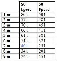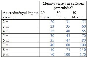 Ez után eldöntjük, körülbelül hány liter vízre lenne szükségünk a felszínen. Megkeressük a szükséges vízmennyiség és a megkapott üzemi vízszint metszetét a második táblázatban, és így megkapjuk, nagyjából hány liter/perces szivattyúra van szükségünk.